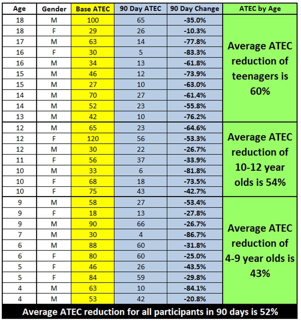 - These results are averaged over all study participants. Some of the children’s ATECs have wobbled all over the place, others have dropped significantly right from the start. Some (including my kids) have gone up somewhere in there.