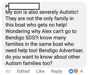 The irony is, that the entire time I have been speaking with journalists, I have been telling them that we are not the only ones in this situation. I have asked people to stand up and tell their own stories, so we can make the public aware of just how many families are struggling with not enough resources. I asked local friends for volunteers, and they also asked around, as the Bendigo Advertiser was keen to run a story on local families with kids with Autism. Nobody came forward. I found two parents interstate who were willing to share publicly, but the journalists here did not want to do stories from interstate.
